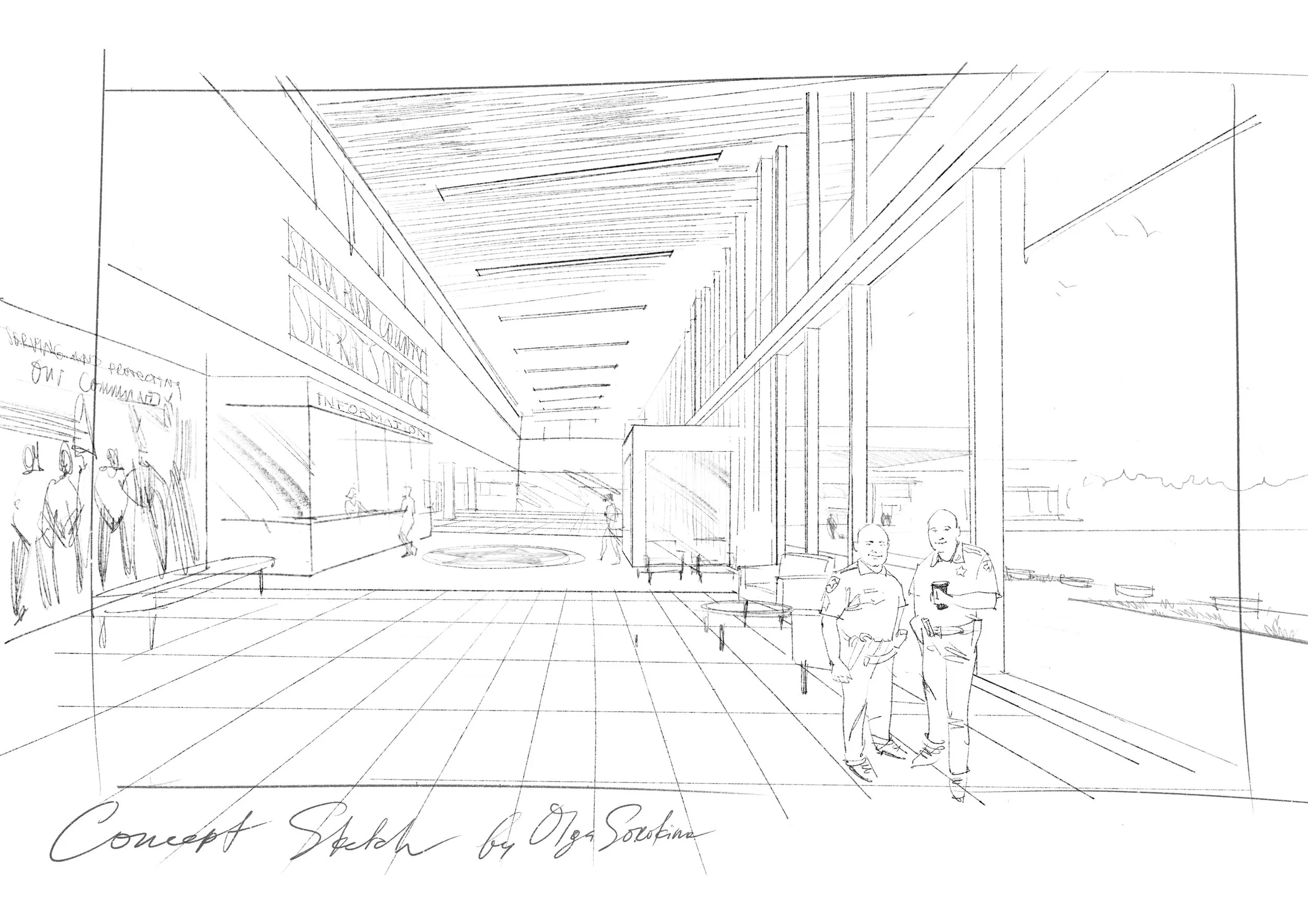 My task was not to design, but to translate all this information into a suggestive sketch, one that communicates the atmosphere without overwhelming detail. As always, I began with a line sketch to establish composition and proportions.