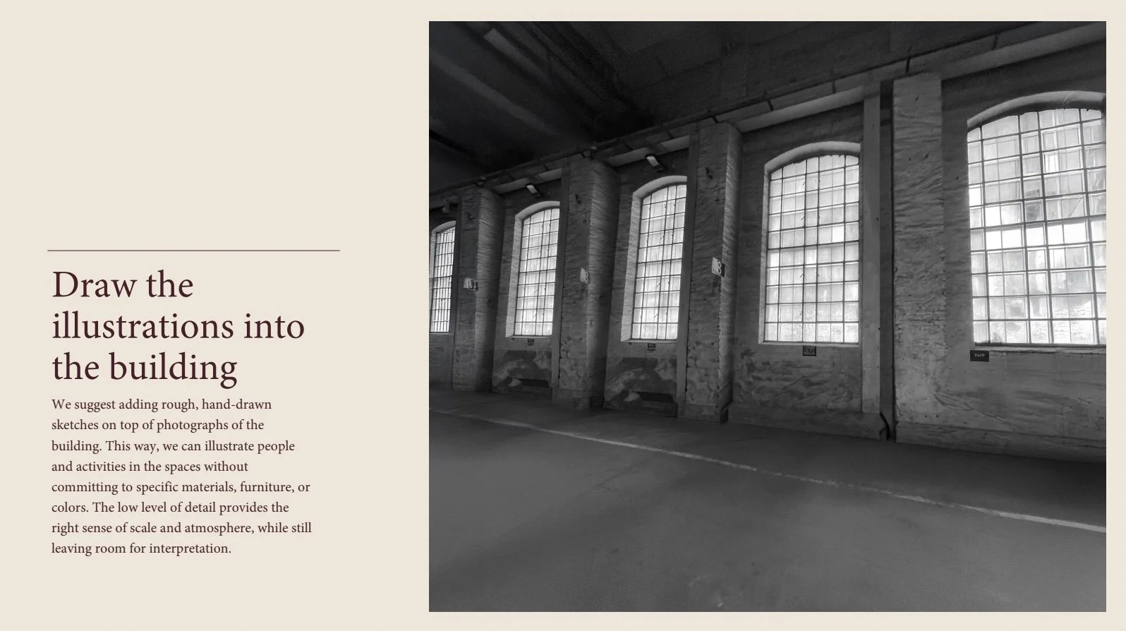 An important part of this project was the fact that I wasn’t drawing from imagination alone, the client visited the building together with a professional photographer. After the visit, they sent me a selection of photographs taken from different angles and invited me to choose two perspectives that I felt would work best for the sketches.